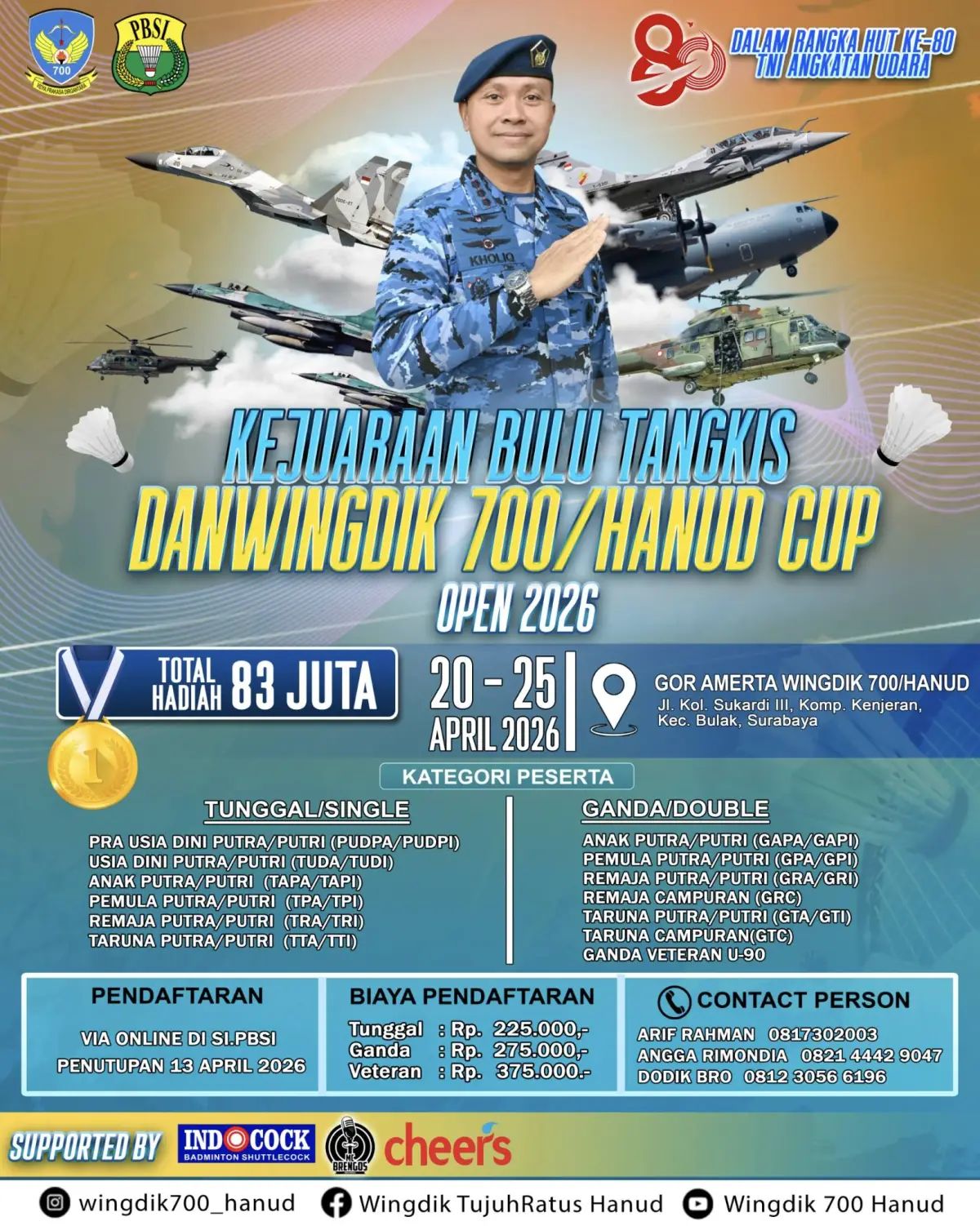 Kejuaraan bulu tangkis DANWINGDIK 700 Hanud Cup Open 2026 resmi digelar dalam rangka memperingati Hari Ulang Tahun (HUT) ke-80 TNI Angkatan Udara. Turnamen ini menjadi salah satu ajang olahraga bergengsi di Surabaya yang terbuka untuk berbagai kategori usia, mulai dari usia dini hingga veteran.